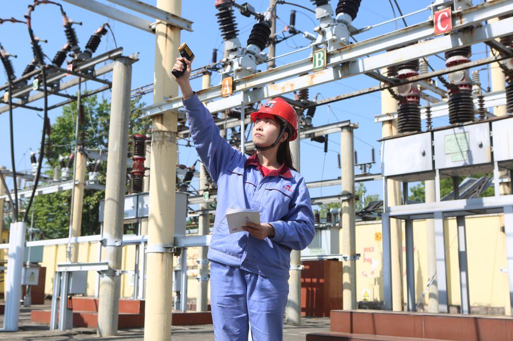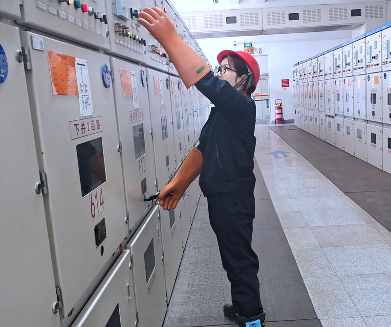 保運(yùn)區(qū)變電所女工謝妍妍檢測高壓供電設(shè)備
