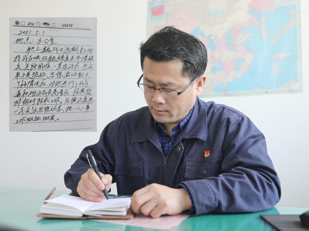 掘進(jìn)二區(qū)黨支部書記魯本岑與職工談心談話后,記錄“民情日記”。其中寫道:……思想波動較大,了解情況后,對他進(jìn)行了開導(dǎo)……把一人一事工作做細(xì)做實(shí)。