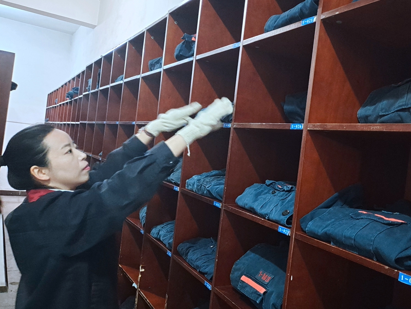 趙白艷,物業(yè)管理科洗衣工。當(dāng)天早上7:00接班后,她就和姐妹迅速進(jìn)入快速忙碌模式。兩個人先是把夜班剛剛收到的臟衣服放入洗衣機(jī),然后把上班人員沒來得及整理的干凈衣服整理上架。她說,目前礦井自營單位加上外委施工人員,一個圓班大約要有700套工作服需要清洗更換。隨著天氣越來越熱,礦工師傅換衣服的頻次會不斷加大,工作量無形中會增加不少。但無論工作再忙再累,服務(wù)質(zhì)量一點(diǎn)兒也不能下降。再說了,礦不久前還在我們這里開了地面現(xiàn)場會,洗衣班就是我們科對外的一扇窗口,大家的滿意就是我們的標(biāo)準(zhǔn)。