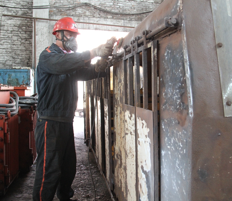 檢修工在聚精會神的打磨“亮化”井下平巷乘人車