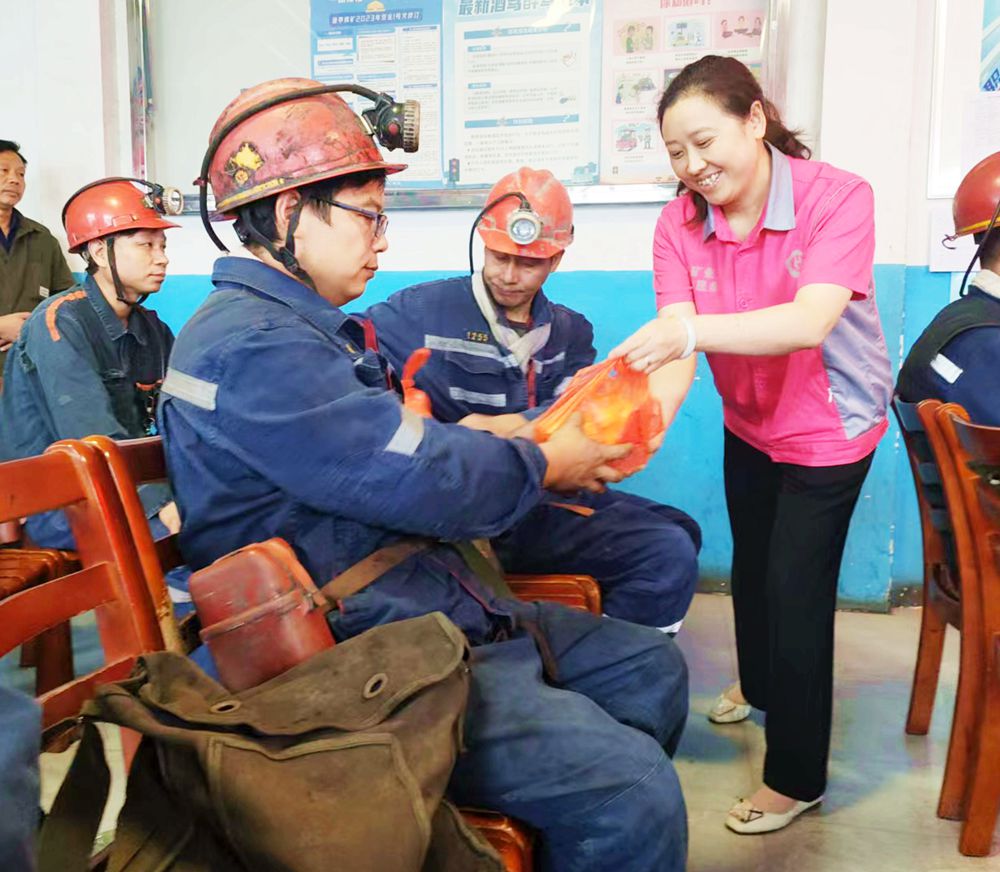 童亭礦女工在班前會為下井職工送去月餅和牛奶等中秋慰問品。
