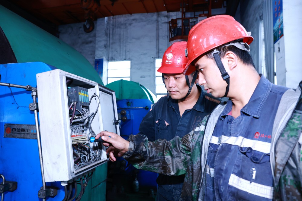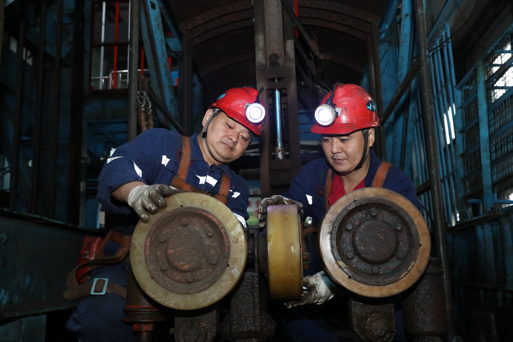 保運區(qū)職工張亞洲、李祥智檢修副井設(shè)備確保安全運行