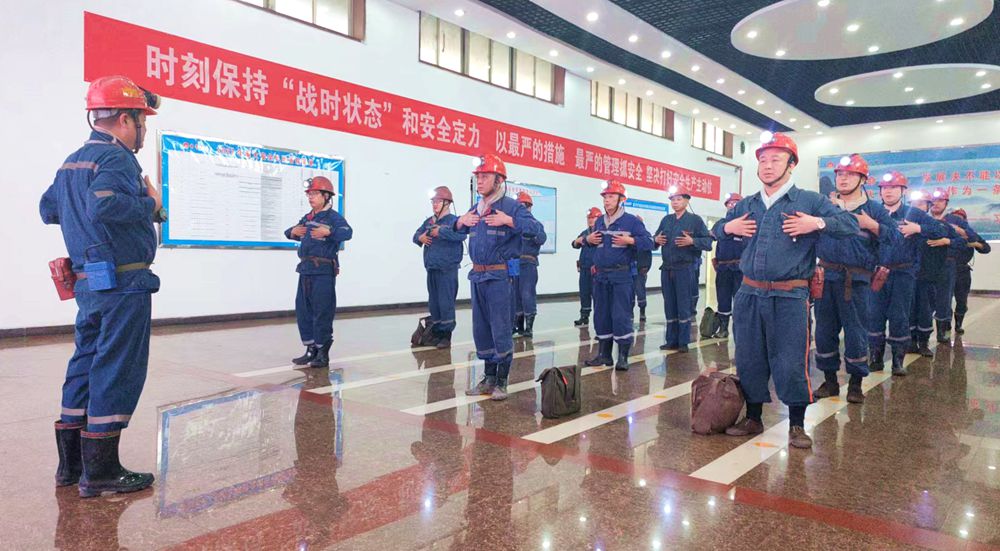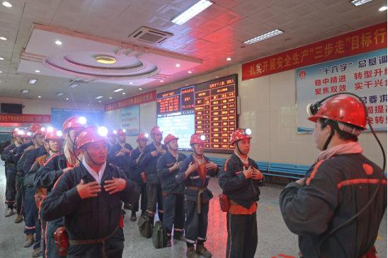 “確保當班無‘三違’好不好,確保當班無事故好不好,好好好!”在井口大廳,運輸區(qū)中班下井職工正在進行入井前安全確認,切實把好安全第一關(guān)。(審核:黃慶慶)