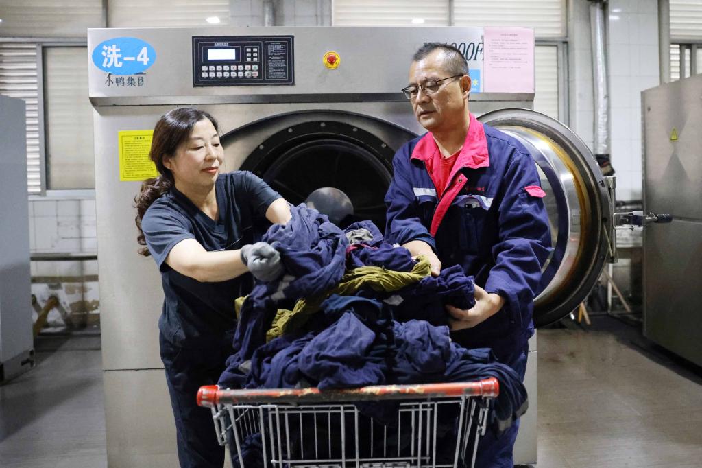 “快快快,抓緊把烘干好的衣服取出來?!卑殡S著機器的轟鳴聲,洗衣房女工陳婉秋和楊襯心開始了一天的辛勤勞作。