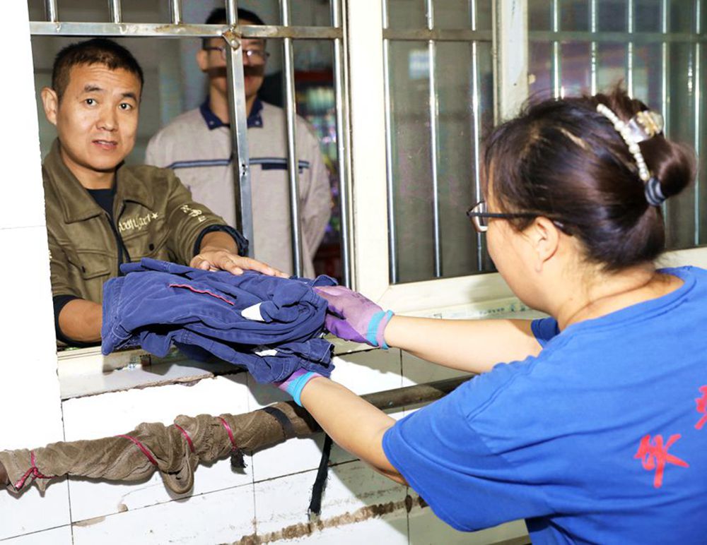 洗衣房女工將清洗干凈的工作服交給準備下井的職工。