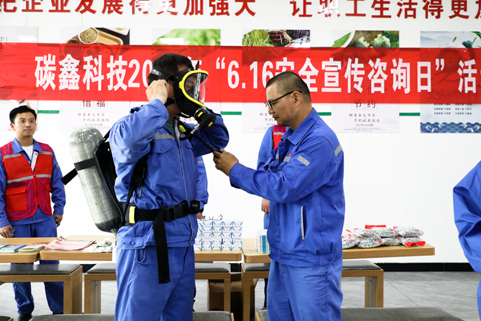 碳鑫科技采取現(xiàn)場教學(xué)的模式,對正壓式空氣器的穿戴使用方法進行講解,提高職工安全技能(閆旭 攝)