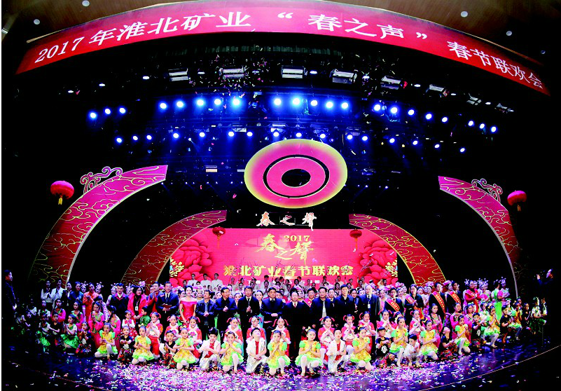 聯(lián)歡會在歌伴舞《明天更美好》中圓滿結束,淮北礦業(yè)領導走上舞臺,與演職員和先進人物代表親切合影留念。