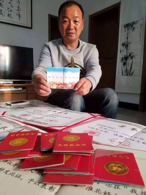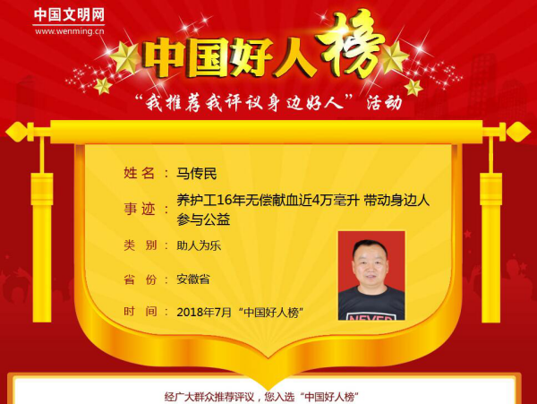“人的生命有限,但在有限的生命里捐獻(xiàn)出血液,挽救其他人的生命,很有意義?!?002年2月14日,馬傳民到市區(qū)辦事時(shí),看到路邊停著一輛采血車,車身上的“無償獻(xiàn)血、無尚光榮”八個(gè)字瞬間吸引了他。懷著好奇的心理,他登上采血車,完成了人生的第一次捐獻(xiàn)。當(dāng)天,他領(lǐng)到了《獻(xiàn)血證》,心底的自豪感油然而生,從此開始每年定期獻(xiàn)血兩次,雷打不動。16年間,他無償獻(xiàn)血38200毫升,其中機(jī)采血小板達(dá)到103個(gè)治療量,獻(xiàn)出的全血和血小板是他全身血液的10倍。先后三次榮獲國家無償獻(xiàn)血奉獻(xiàn)獎金獎、安徽省2015年度“獻(xiàn)血公益之星”、2018年“安徽好人”、第五屆淮北市道德模范、“淮北好人”、淮北礦業(yè)2017年精神文明好人好事等榮譽(yù)稱號,大大小小的榮譽(yù)證書和16本鮮紅的獻(xiàn)血證差不多鋪滿整張桌面。