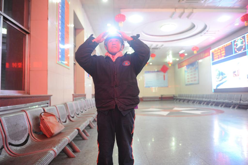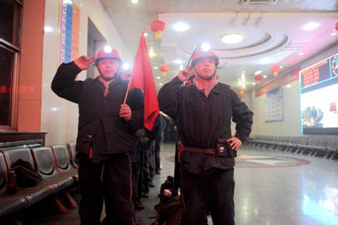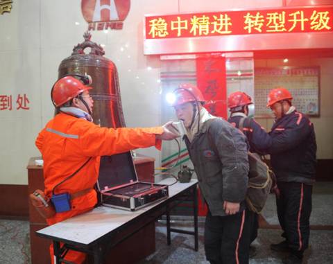 春節(jié)放假留守入井人員進行入井前的安全確認。入井職工個個精神抖擻,鏗鏘有力的安全確認聲久久回蕩在候罐大廳。(王文東)