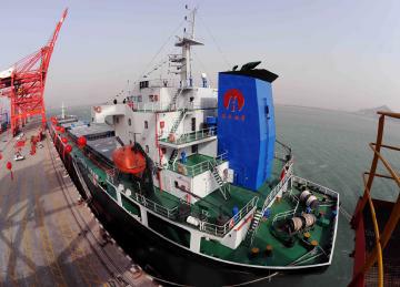 圖為2.8萬噸級(jí)“淮潤(rùn)1”輪在連云港港口首航成功。(陳幫干 攝)