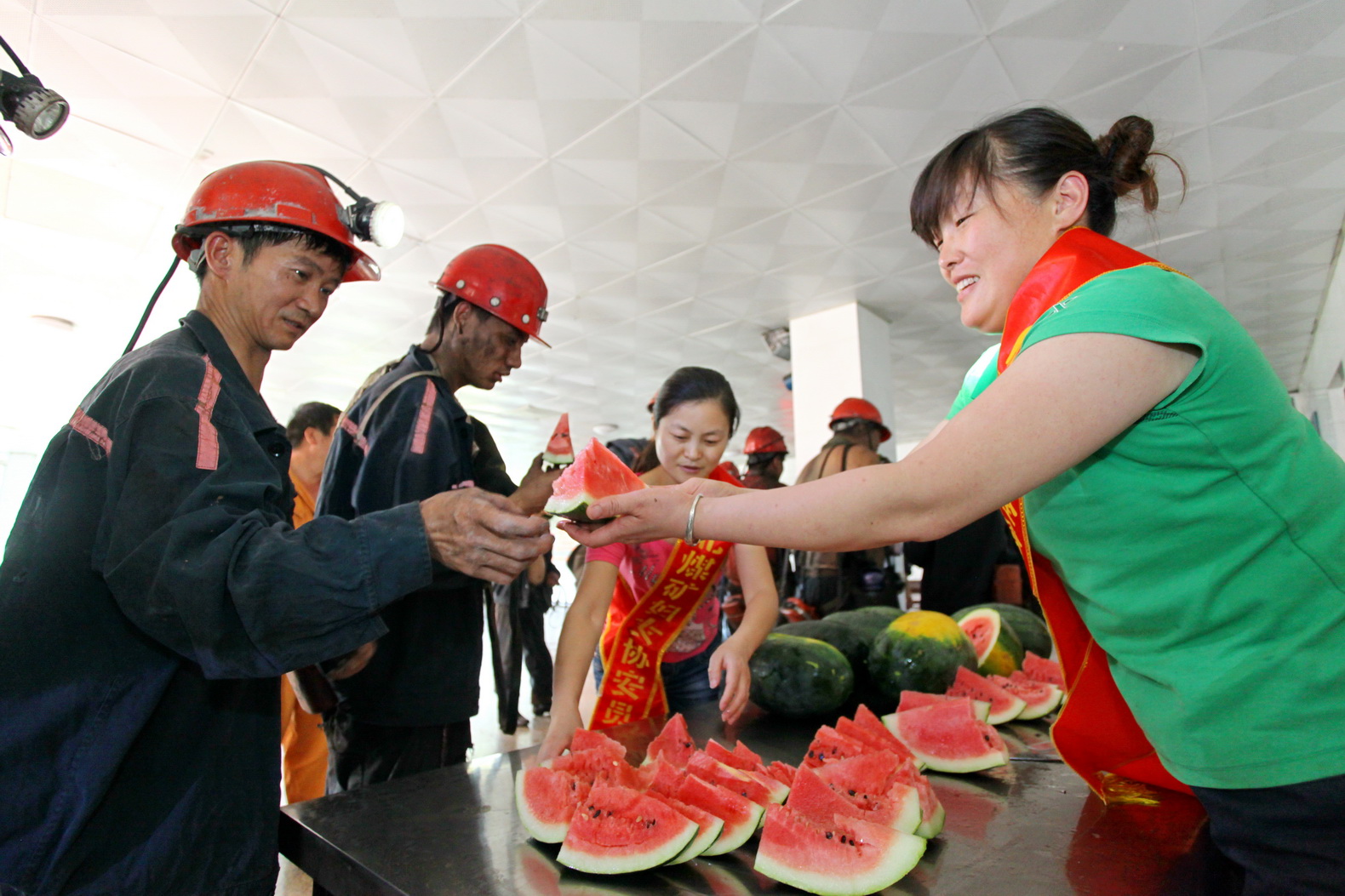 為了讓職工師傅升井的第一時間吃上清涼可口的西瓜,協(xié)安員們提前用自來水將西瓜冰好。中午1點多,協(xié)安員們便在副井口候罐室拉開陣勢,洗的洗,切的切,不一會,一塊塊鮮美可口的西瓜呈現(xiàn)在活動現(xiàn)場。隨著升井職工的到來,協(xié)安員面帶微笑將一塊塊充滿親情與關(guān)懷的西瓜送到職工手中,并不時地叮囑著:“辛苦了,多吃幾塊,上班千萬要注意安全!”“今天可真熱啊,真沒想到剛一升井就能吃到這么好的西瓜,真是太感謝了!”一位職工師傅高興的說。