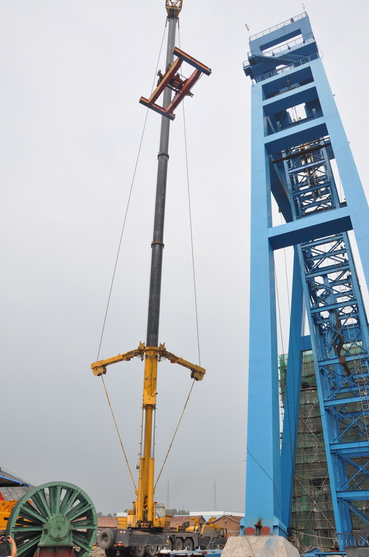 工程建設(shè)公司一次吊裝成功楊柳礦新主井總重達(dá)55噸的天輪。