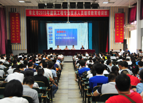 7月24日上午,由淮北市城鄉(xiāng)建設(shè)委員會(huì)主辦的2015年全市建設(shè)工程專業(yè)技術(shù)人員繼續(xù)教育培訓(xùn)班培訓(xùn)班在安徽礦業(yè)職業(yè)技術(shù)學(xué)院開班,來自全市在職的建設(shè)工程專業(yè)中級(jí)以下(含中級(jí))技術(shù)人員1200余人參加了這次培訓(xùn)。