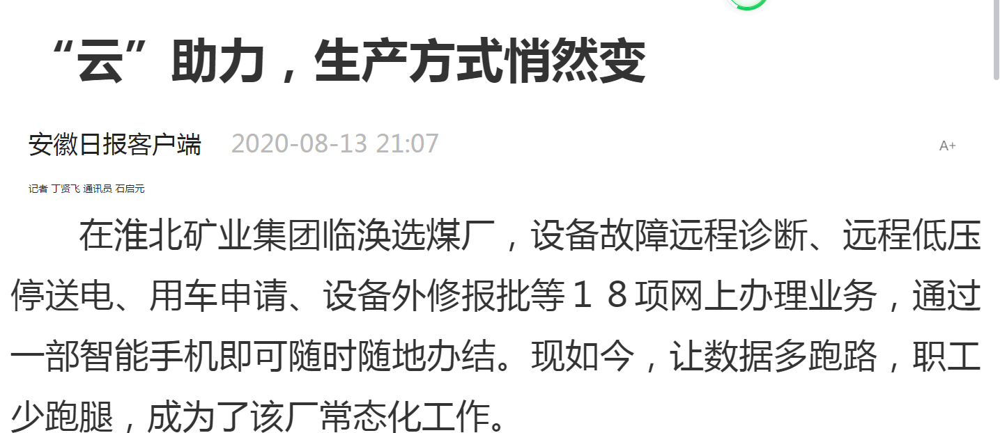 在安徽省淮北礦業(yè)集團臨渙選煤廠,設(shè)備故障遠程診斷、遠程低壓停送電、用車申請、設(shè)備外修報批等18項網(wǎng)上辦理業(yè)務(wù),通過一部智能手機即可隨時隨地辦結(jié)?,F(xiàn)如今,讓數(shù)據(jù)多跑路,職工少跑腿,成為了該廠常態(tài)化工作。