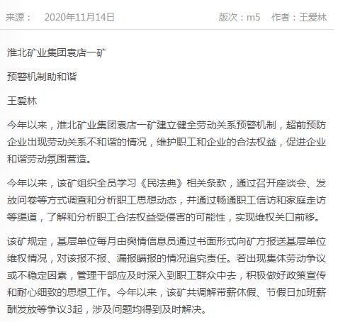 《中國煤炭報》:淮北礦業(yè)集團袁店一礦預(yù)警機制助和諧
