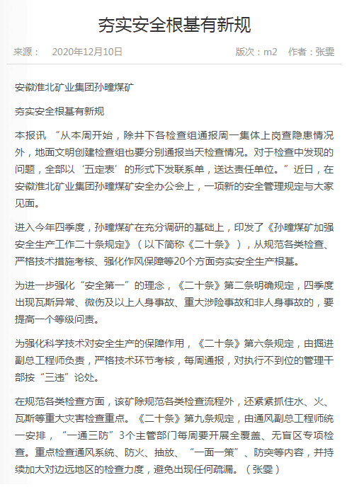 《中國(guó)煤炭報(bào)》:淮北礦業(yè)集團(tuán)孫疃礦夯實(shí)安全根基有新規(guī)