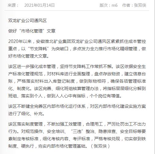 《中國(guó)煤炭報(bào)》:淮北礦業(yè)集團(tuán)雙龍礦業(yè)通風(fēng)區(qū)做好“市場(chǎng)化管理”文章