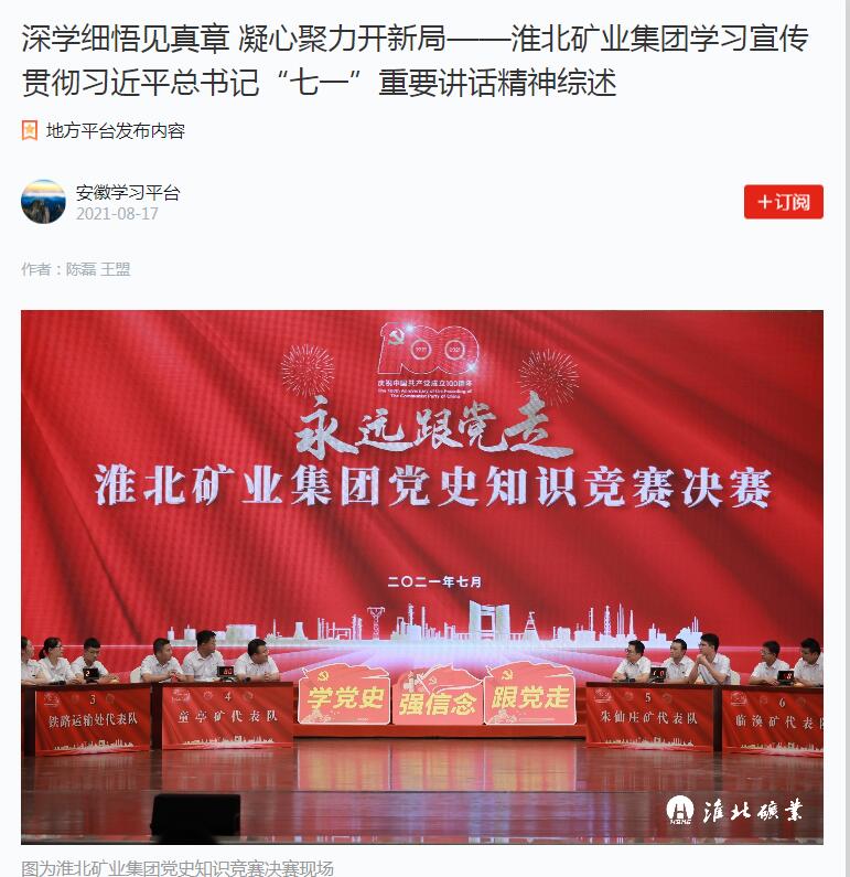 淮北礦業(yè)集團(tuán)積極拓展學(xué)習(xí)路徑,統(tǒng)籌好內(nèi)宣外宣資源,創(chuàng)新宣傳形式,全方位、多層次宣傳報(bào)道“七一”重要講話精神,推動(dòng)學(xué)習(xí)貫徹走深走實(shí)走心。