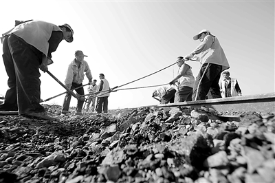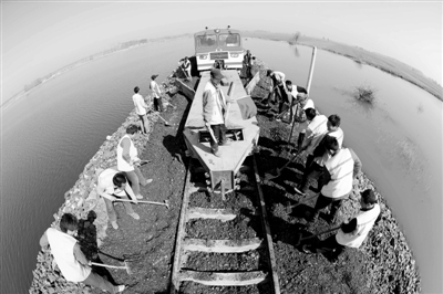 又是一年雨季“三防”。安徽淮北礦業(yè)集團(tuán)鐵運處朱仙莊至王橋鐵路專用線上,朱仙莊領(lǐng)工區(qū)全體職工在對塌陷區(qū)段線路進(jìn)行集中施工搶修。