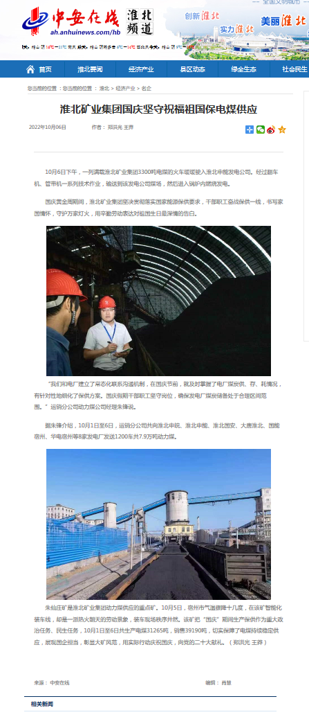《中安在線》:淮北礦業(yè)集團(tuán)國(guó)慶堅(jiān)守祝福祖國(guó)保電煤供應(yīng)