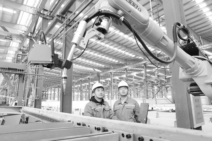 日前,安徽淮北礦業(yè)集團(tuán)“十四五”發(fā)展規(guī)劃重點(diǎn)項(xiàng)目——安徽綠廈智建公司智能建造項(xiàng)目“板架合一”裝配式鋼結(jié)構(gòu)建筑構(gòu)件智能生產(chǎn)線(xiàn)進(jìn)入生產(chǎn)試運(yùn)行階段。圖為11月3日,兩名員工對(duì)操作地軌七軸焊接機(jī)器人進(jìn)行焊前校正。(喬時(shí)慶 攝)
