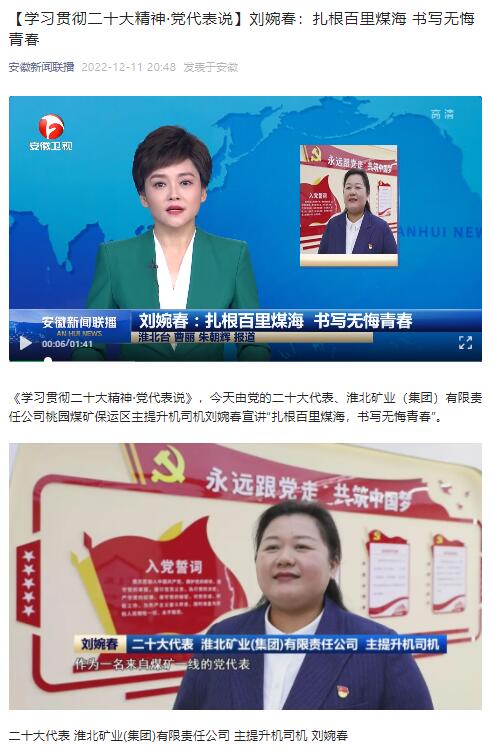 《學(xué)習(xí)貫徹二十大精神·黨代表說》,今天由黨的二十大代表、淮北礦業(yè)(集團(tuán))有限責(zé)任公司桃園煤礦保運(yùn)區(qū)主提升機(jī)司機(jī)劉婉春宣講“扎根百里煤海,書寫無悔青春”。