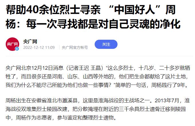 經(jīng)過資料查閱,線索摸排,實(shí)地尋找求證,周楊成功為江蘇淮安籍烈士張永和、山東濟(jì)寧籍烈士王保榮等近10名烈士家屬尋找到了親人的埋骨之地。