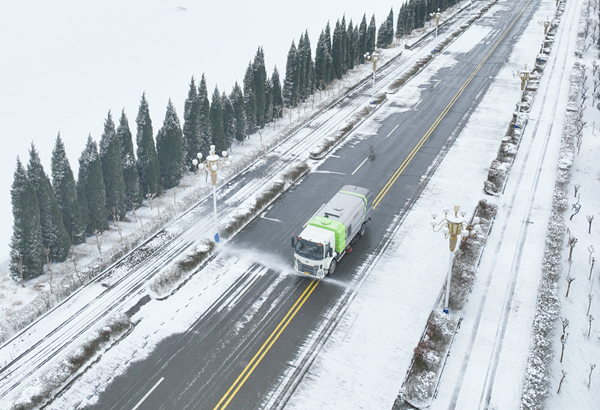 孫疃礦立即啟動應急預案,出動人員和設(shè)備上路除雪保暢通。陳更攝