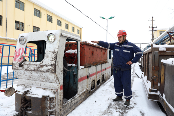 桃園礦運輸區(qū)一名職工對電機車安全運行狀態(tài)進行安全確認。陳敏奎攝