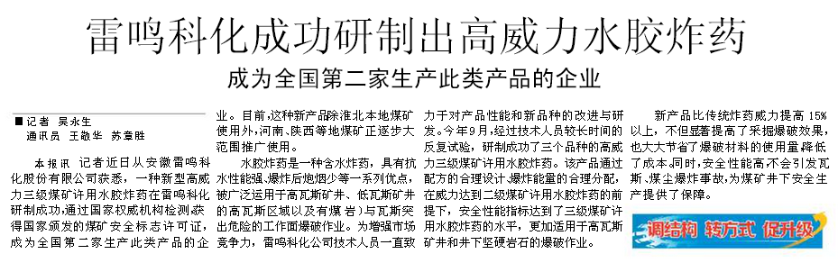 近日,一種新型高威力三級煤礦許用水膠炸藥在雷鳴科化研制成功,并通過國家權威機構檢測,獲得了國家頒發(fā)的煤礦安全標志許可證。標志著該品種炸藥可以廣泛運用在煤礦井下。目前,這種新產品除淮北本地煤礦在使用外,河南、陜西等地煤礦正逐步大范圍推廣使用。