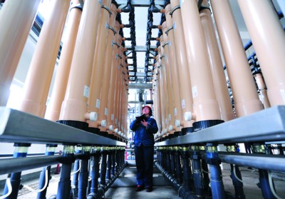 4月8日,工作人員查看淮北礦業(yè)臨渙焦化廢水深度處理項目超濾車間設(shè)備運轉(zhuǎn)情況?;幢钡V業(yè)臨渙焦化廢水深度處理一期項目日前建成投用,采用先進(jìn)技術(shù)處理焦化廢水,實現(xiàn)回收再利用,每天可生產(chǎn)1680立方米循環(huán)冷卻水和1920立方米鍋爐補(bǔ)給水,系統(tǒng)水回用率達(dá)75%。 本報記者 程兆 攝