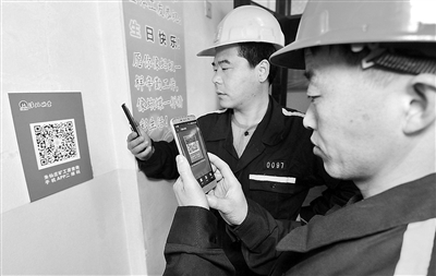 安徽淮北礦業(yè)集團(tuán)把職工工資、獎(jiǎng)金分配情況通過公開欄、工資查詢系統(tǒng)等渠道向職工公開,給職工一本明白賬。圖為朱仙莊煤礦綜掘二區(qū)2名礦工正在單位會(huì)議室用手機(jī)掃二維碼查詢收入情況。 張萬學(xué) 攝