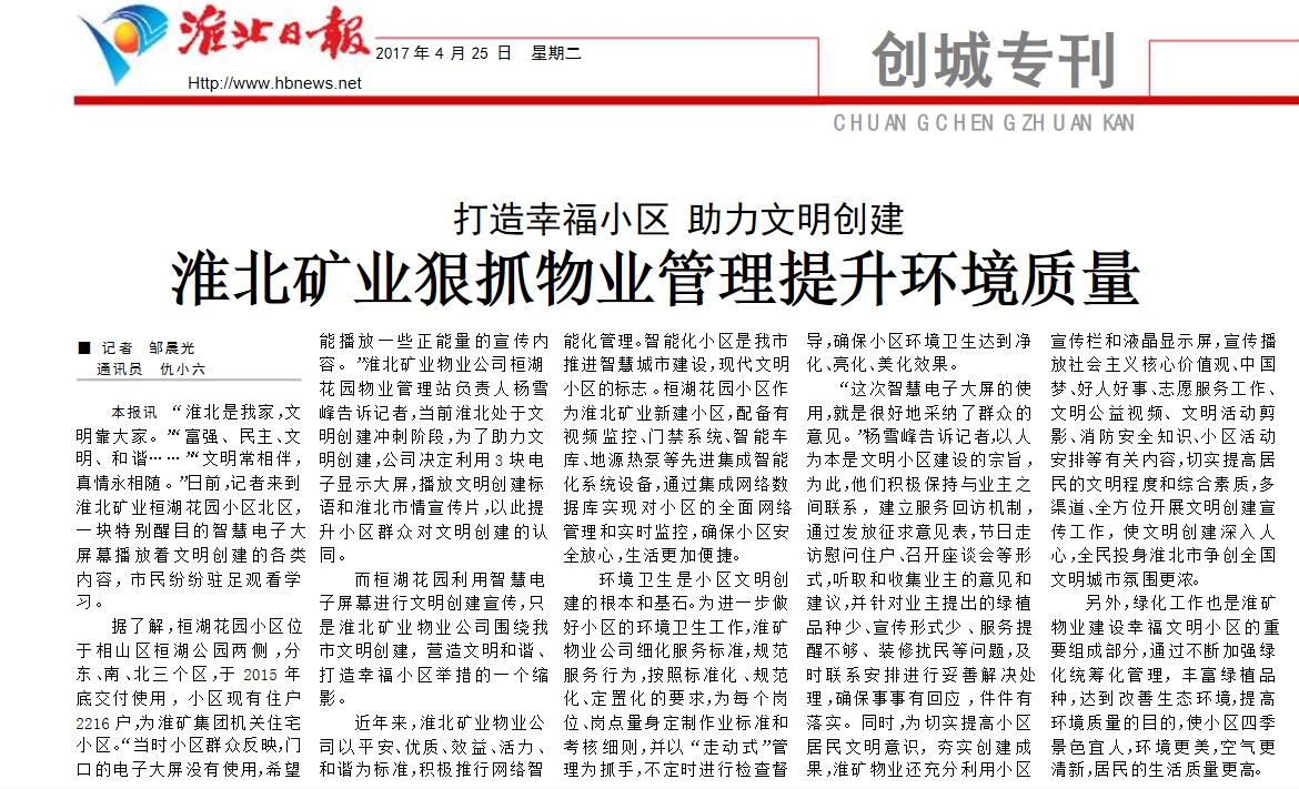 而桓湖花園利用智慧電子屏幕進行文明創(chuàng)建宣傳,只是淮北礦業(yè)物業(yè)公司圍繞我市文明創(chuàng)建,營造文明和諧、打造幸福小區(qū)舉措的一個縮影。