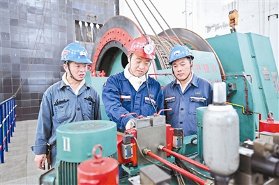 ▲付軍(中)在檢測副井絞車大繩磨損和斷絲情況 |