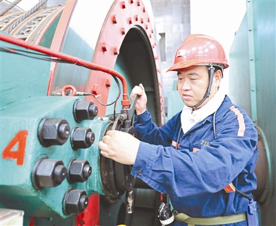 ▲付軍在檢測副井提升系統(tǒng)絞車液壓裝置 |